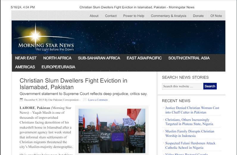 Google Scholar, International Christian Slum Dwellers Fight Eviction in Islamabad, Pakistan – Morningstar News