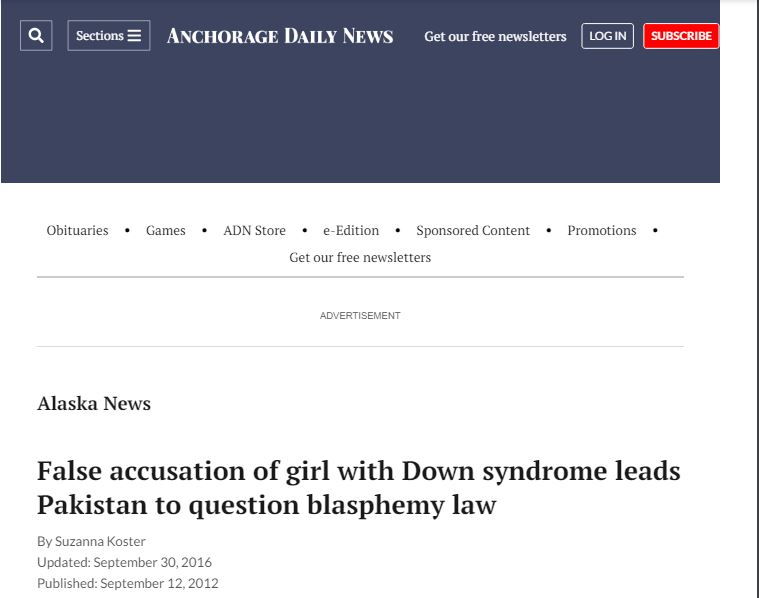 Google Scholar, International False accusation of girl with Down syndrome leads Pakistan to question blasphemy law – Anchorage Daily News