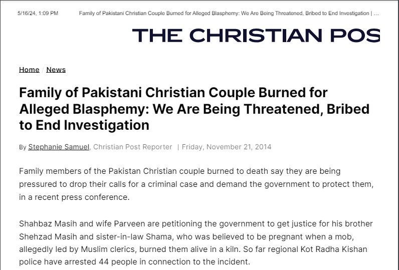 Google Scholar, International Family of Pakistani Christian Couple Burned for Alleged Blasphemy_ We Are Being Threatened, Bribed to End Investigation _ World News